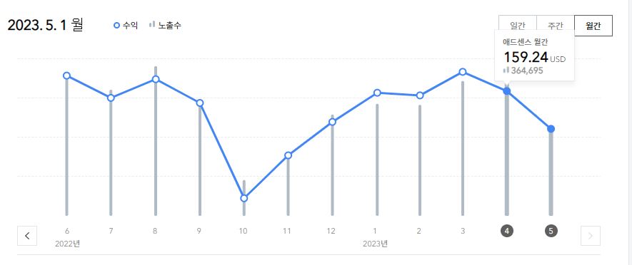 2023년 4월 월간애드센스 수익은 159.24달러였습니다 364695 광고뷰를 기록했는데도 6만뷰가 부족한 달보다 수익이 적었습니다..애드센스는 어떤 수익성 좋은 광고나 클릭수에 따라 로또기 때문에...수시로 변합니다