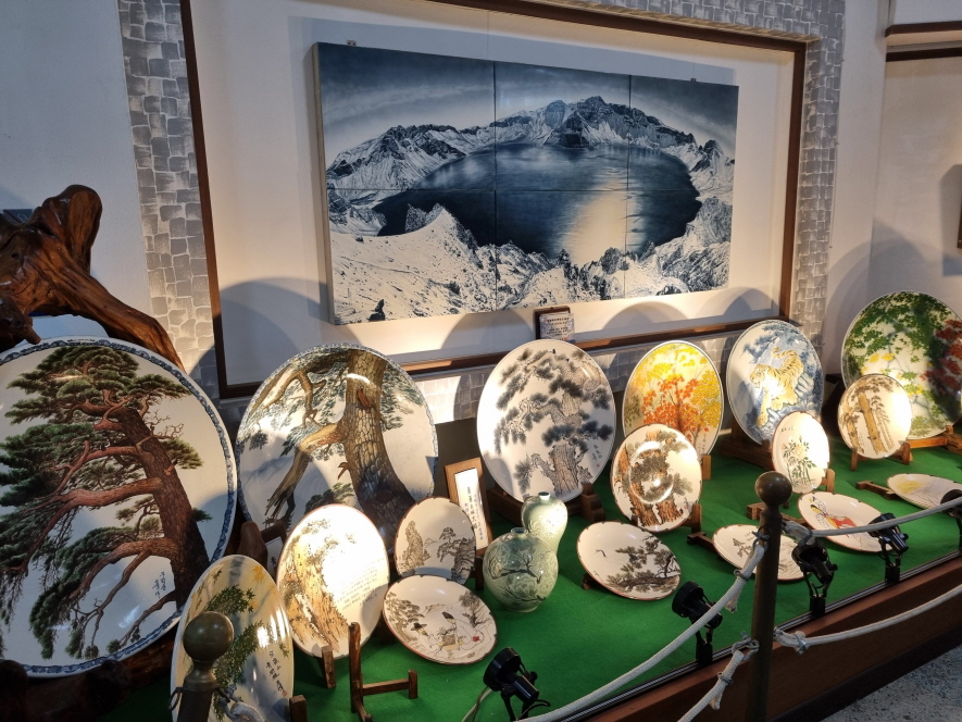백두산도벽입니다 나무를 그린 여러 그릇형 도자기들도 많이 있습니다 실제로는 전시만하지 실제로는 당연히 못쓸거 같네요ㅎㅎ